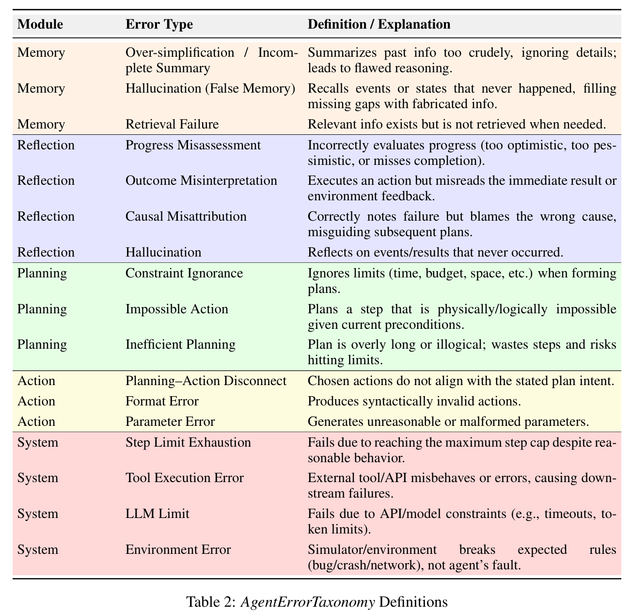 AgentErrorTaxonomy(对agent的错误进行归类,见下表)、AgentErrorBench(对agent的错误trajectory进行人工标注,注明错误类型,构成数据集)、AgentDebug(agent执行流程设计,对有错误的trajectory,回溯到第一个错误执行节点并重新rollout)。 - 下表为按照agent功能模块划分的错误类型。本文将功能模块划分成Memory、Reflection、Planning、Action等四个功能模块,其中,Memory模块的主要错误包括过于简化/总结不全、幻觉(不存在的记忆)、检索失败;Reflection模块的主要错误包括对进展的错误评估、对结果的错误解读、错误归因、对结果/过程产生幻觉;Planning模块的主要错误包括忽略约束、规划不可能完成的行为、不充分的规划;Action模块的主要错误包括规划-行动不匹配、格式错误、参数错误。此外,还存在系统层级的错误,比如超过了执行步骤上限、工具调用错误(工具本身报错)、LLM Api限制、环境错误等。